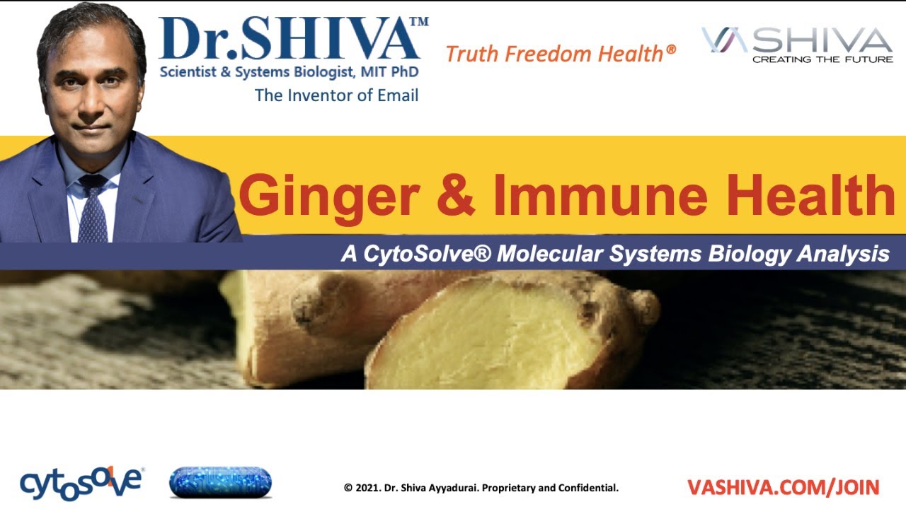 Dr.SHIVA LIVE: The Power of Ginger for Immune Health and Much More - A CytoSolve Molecular Systems Analysis. Dr.SHIVA Ayyadurai, MIT PhD in Biological Engineering, the Inventor of Email, Scientist, Engineer, Educator provides a systems biology analysis of the multi-systems effects of the nutrient Ginger, with a focus on Immune Health. Dr.SHIVA teaches a course Foundations of Systems so YOU can understand the science of all systems to reveal THREE Principles that will enable YOU to WIN #TruthFreedomHealth: 1) The interconnection of Truth Freedom Heath; 2) Why a bottom's up decentralized movement is necessary; and, 3) The insidious not-so-obvious-establishment which is the eternal disturbance to winning YOUR #TruthFreedomHealth. Learn the Foundations of Systems at VASHIVA.COM/JOIN. Get Educated or Be Enslaved. Become a TruthFreedomHealth Warrior. VASHIVA.COM/WARRIOR